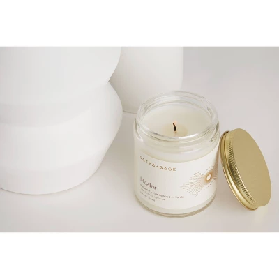 Create a soothing, grounding atmosphere for self-care and relaxation in your home with the earthy and relaxing scent of the Healer Candle from Satya + Sage. This eco-friendly vegan candle is made with coconut and soy wax, and is infused with phthalate-free fragrance oils for a warm, woody scent with bergamot, sandalwood and vanilla notes. The nature-inspired aromas help create a calming and grounding effect while you enjoy some downtime reconnecting with yourself and nature, transported by woodsy, earthy hints of peppery and citrusy bergamot, followed by amber and a rich, grounded base of vanilla, oud and sandalwood. Plus, the beautiful and eco-friendly design features a cotton wick, reusable/recyclable glass jar, and either a plantable wildflower seed cover (9-ounce candle) or classic gold lid (5-ounce candle) for beautiful display on a countertop or end table. For best results, burn your Healer candle for 2–3 hours when you first light it for a full melt pool. This will help ensure your Satya + Sage candle will burn beautifully for its full lifespan. Be sure your wick is no more than ¼ inch before each use.