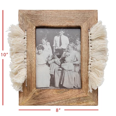 Exclusively designed by Foreside Home & Garden, this 5×7 picture frame is the perfect addition to your boho home decor. The sustainable natural mango wood paired with the white cotton give this piece a soft and natural boho vibe. Featuring hand attached cotton tassels that fringe out from the sides of the frame to create a textural dream. The glass front will help to protect your photo from dust and other damage. This piece will look great placed on your shelf, desk, side table or mantel for a versatile display anywhere in your home.