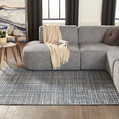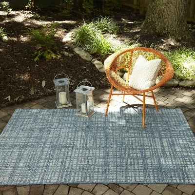 The expressive linear pattern of this particular design adds a textural layer beneath formal furnishings and patio sets alike. The contemporary crosshatched design is created from a graphic repeat of irregular blue lines that boldly intersect as they strike across the soft gray surface. Precision made from polypropylene fibers, the all-weather rug is a stain-resistant floorcovering suitable for styling both interior and exterior environments.