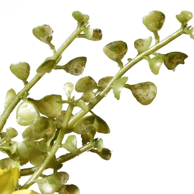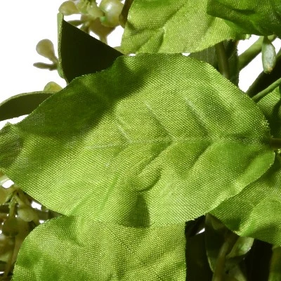 This wreath features bright yellow mini cosmos flower blooms that are mixed with assorted complimenting leafy green stems. Welcome the spring and summer season with this bright and attractive decoration. Hang this wreath on doors, walls and windows in indoor or covered outdoor locations.