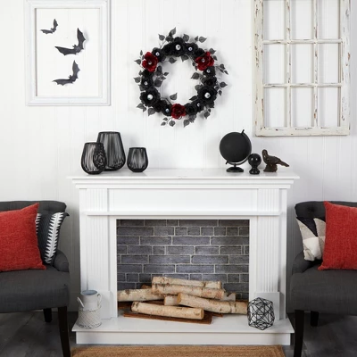 Keep a wondering eye throughout Halloween with this spooky eyeballs wreath. Blue and green eyeballs are nestled in between red and black flowers for an edgy look that’ll satisfy even the pickiest Halloween enthusiasts. Be different and bold. With a dimension of 24in. house in any area that needs an extra pair of eyes. Add to a bare wall or door. Artificial wreaths are manufactured using synthetic materials, such as polyester material or plastic, and are well designed and constructed to be life-like in appearance. This item will need to be re-shaped when removed from the secure box to allow it to reach its fullest size. Your wreath will look beautiful for years to come; simply wipe clean with a soft dry cloth when needed.