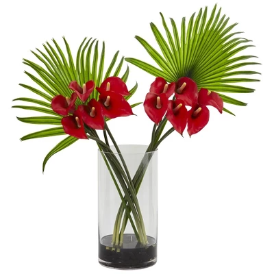The petals on this artificial calla lily arrangement provide a beautiful accent color to the green foliage that shine like naturally watered leaves. With faux water and natural river rocks, this dramatic calla lily arrangement will look lovely on an entryway or end table.