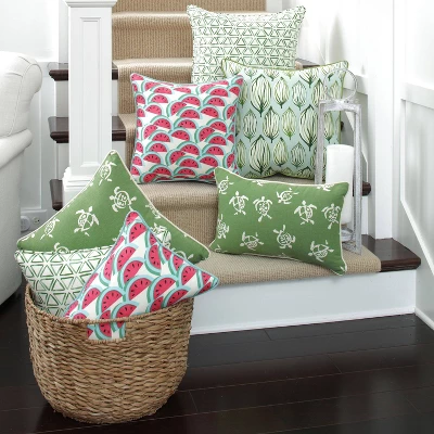 Add a cool touch of relaxation to your decor with a throw pillow in a distinctive ,soothing design. Its painterely green leafy vertical pattern over an off white is delicate and set against an aqua background. Made from 100% cotton. Additional features of this throw pillow include a contrast welt cord for a beautiful finish and recycled polyester fiber fill with a sewn seam closure.